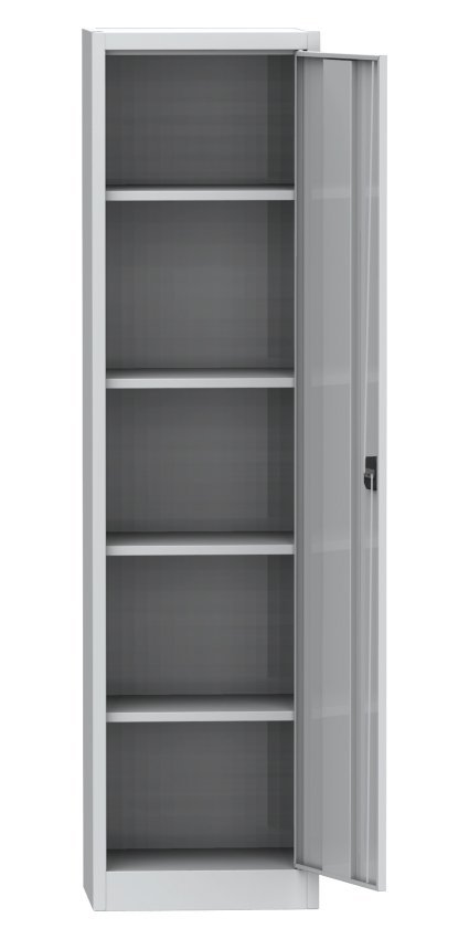 Szafka z drzwiami pełnymi, wysokość 1150 x szerokość 505 x głębokość 400 mm. Ryglowanie na zamek bębenkowy z mechanizmem rozstawu osi. 2 x regulowane półki stalowe (nośność 60 kg). Możliwość wymiany drzwi pełnych na drzwi z wypełnieniem szklanym, z wypełnieniem drucianym lub drzwi laminowane w odcieniu buku, brzozy lub wiśni. Kolor korpusu RAL 7035 jasnoszary.