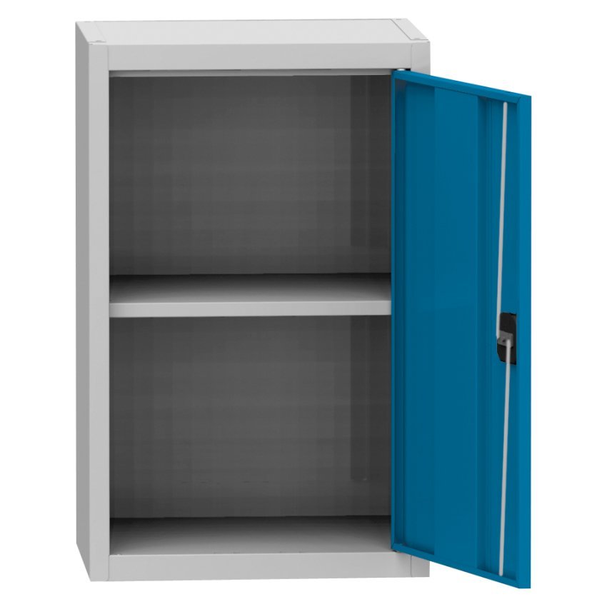 Szafka z drzwiami pełnymi, wysokość 800 x szerokość 505 x głębokość 400 mm. Ryglowanie na zamek bębenkowy z mechanizmem rozstawu osi. 1 x regulowana półka stalowa (nośność 60 kg). Możliwość wymiany drzwi pełnych na drzwi z wypełnieniem szklanym, z wypełnieniem drucianym lub drzwi laminowane w odcieniu buku, brzozy lub wiśni. Kolor korpusu RAL 7035 jasnoszary.