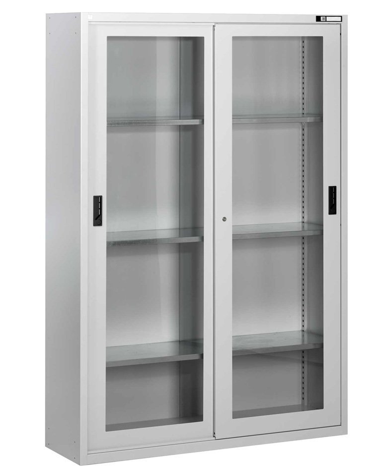 Szafa z drzwiami przesuwnymi, 3 x półki regulowane w rastrze 25 mm (ocynkowane), drzwi pełne, nośność 600 kg. Wysokość 1950 x szerokość 1350 x głębokość 405 mm, drzwi szklane w ramie stalowej.