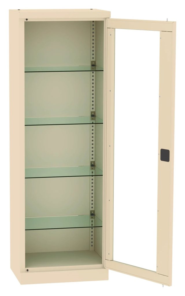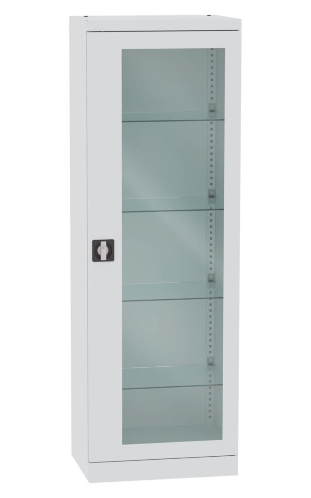 Szafa ze szklanymi drzwiami i półkami, wysokość 1800 x szerokość 600 x głębokość 435 mm. Zamek dwupunktowy. 4x regulowana półka szklana (nośność 25 kg) regulowana w odstępach co 25 mm. Szklane drzwi i szklane półki wykonane są ze szkła hartowanego.