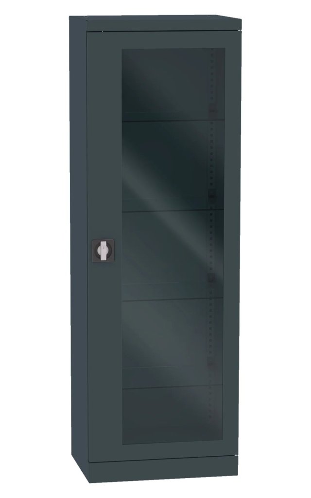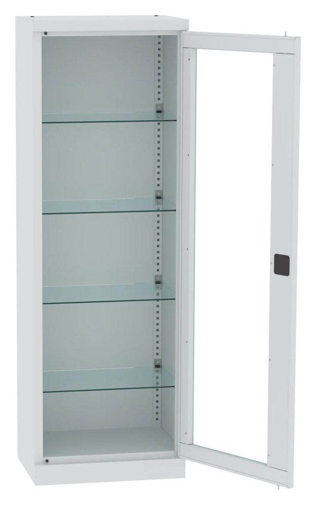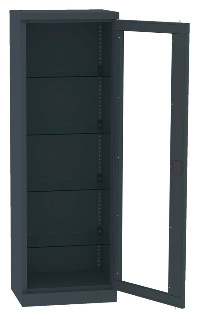 Szafa ze szklanymi drzwiami i półkami, wysokość 1800 x szerokość 800 x głębokość 435 mm. Zamek dwupunktowy. 4x regulowana półka szklana (nośność 25 kg) regulowana w odstępach co 25 mm. Szklane drzwi i szklane półki wykonane są ze szkła hartowanego.