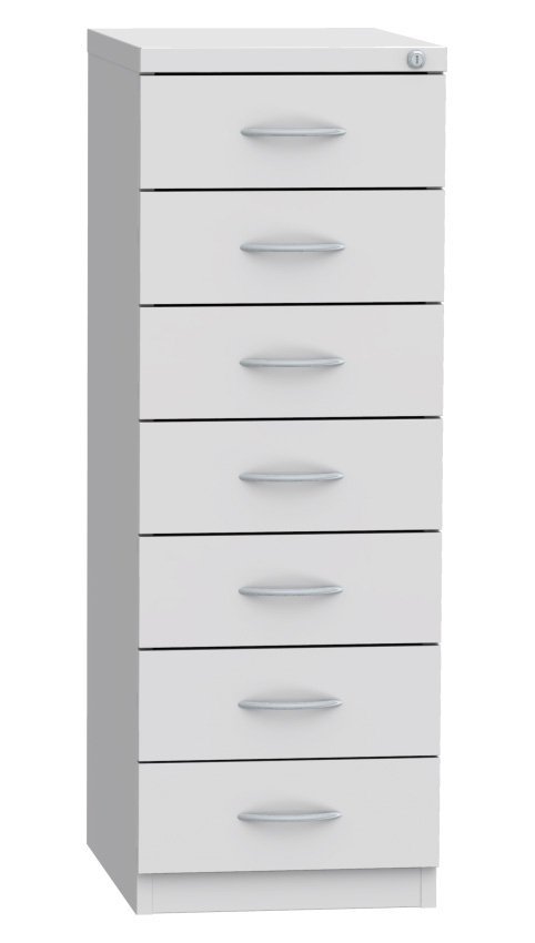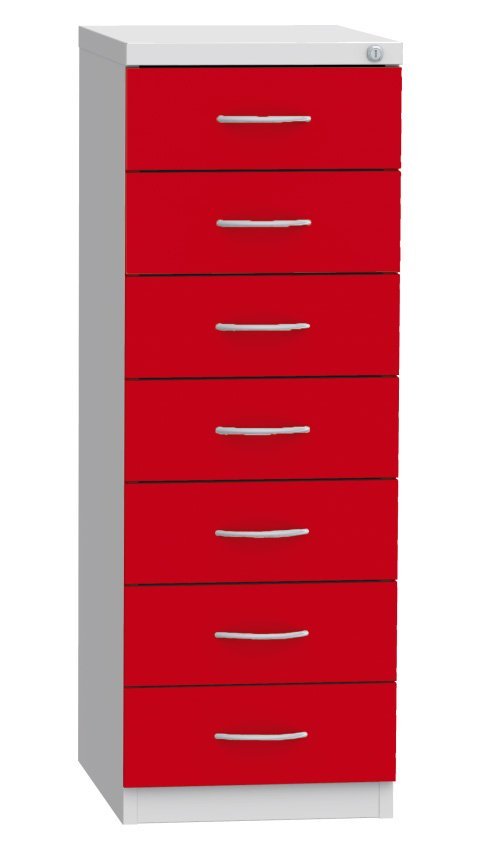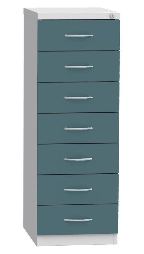 Szafka na dokumenty w formacie A6 z siedmioma szufladami (w każdej szufladzie znajdują się 2 przegródki). Wysokość 1250 x szerokość 440 x głębokość 600 mm. Korpus metalowy w kolorze jasnoszarym RAL 7035, szuflady w różnych kolorach, zamek centralny.