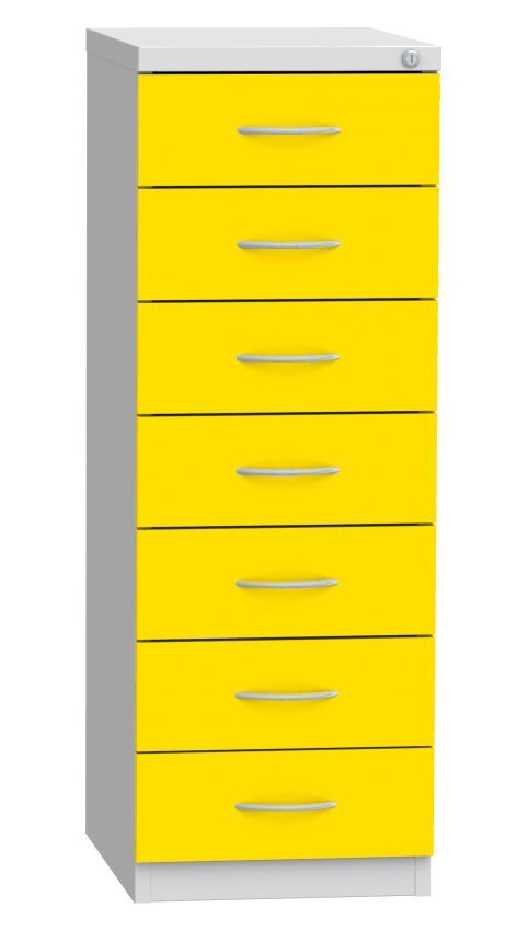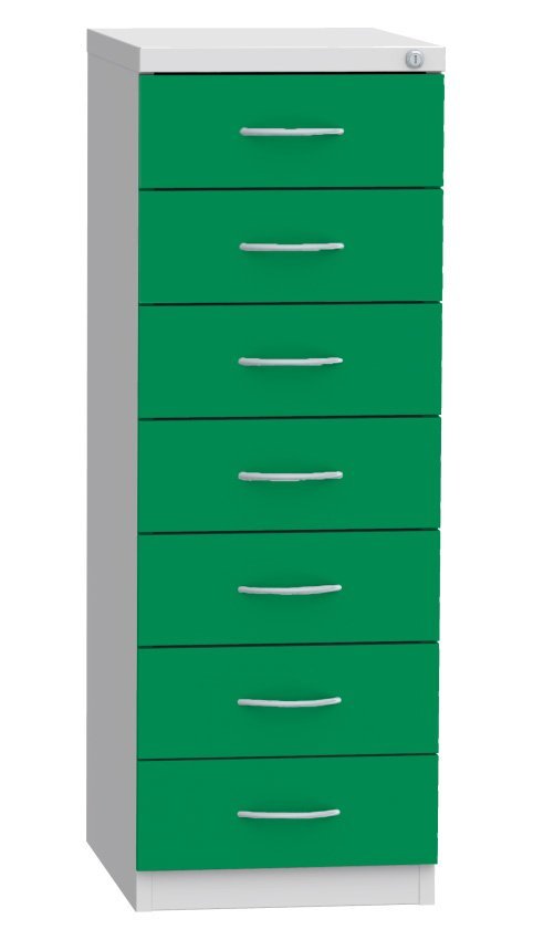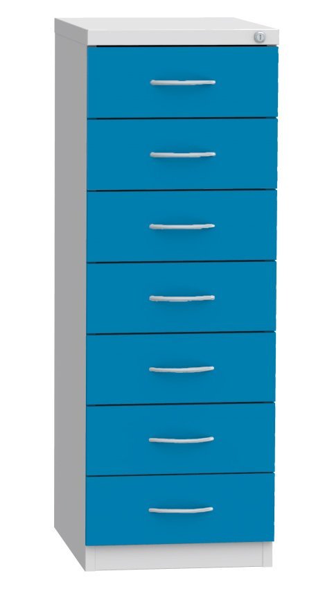 Szafka kartotekowa z siedmioma szufladami na dokumenty formacie A6 (w każdej szufladzie znajdują się 2 przegródki). Wysokość 1250 x szerokość 440 x głębokość 600 mm. Korpus metalowy w kolorze jasnoszarym RAL 7035, szuflady w różnych kolorach, zamek centralny.