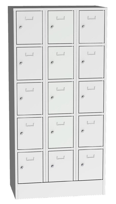 Szafka metalowa z piętnastoma zamykanymi schowkami, szerokość 900, wysokość 1850, głębokość 500 mm. Szerokość schowka 300 mm, standardowy zamek można zastąpić kłódką lub zamkiem na monety. Kolor korpusu RAL 7035 jasnoszary.