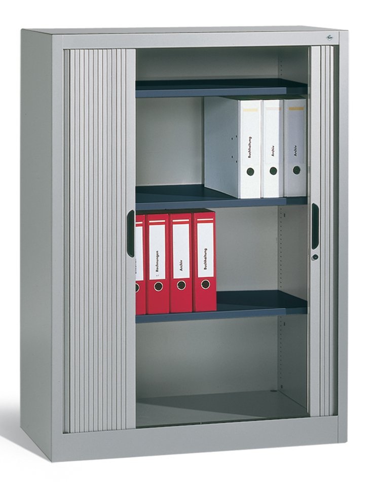 Metalowa szafka żaluzjowa. Wysokość 1345, szerokość 1000, głębokość 420 mm. 3 półki. Kolor korpusu i żaluzji jasnoszary RAL 7035/antracyt RAL 7021.