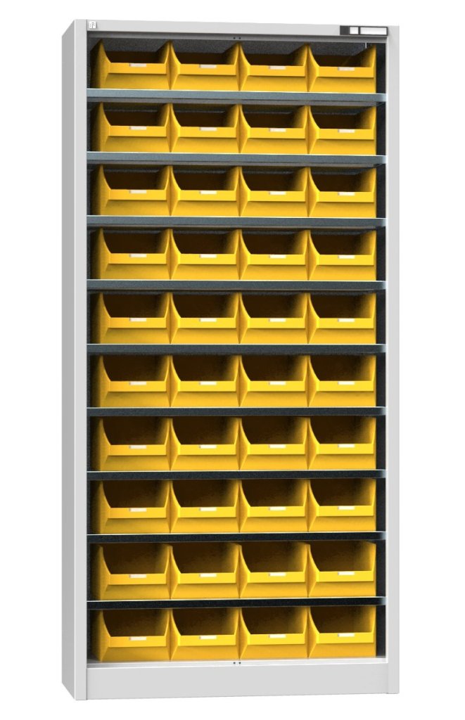 Szafa UK1 ze skrzynkami plastikowymi, 9x półek, 40x box 4 (wysokość 150, szerokość 204, głębokość 350 mm), nośność szafki 400 kg. pełny opis i parametry
