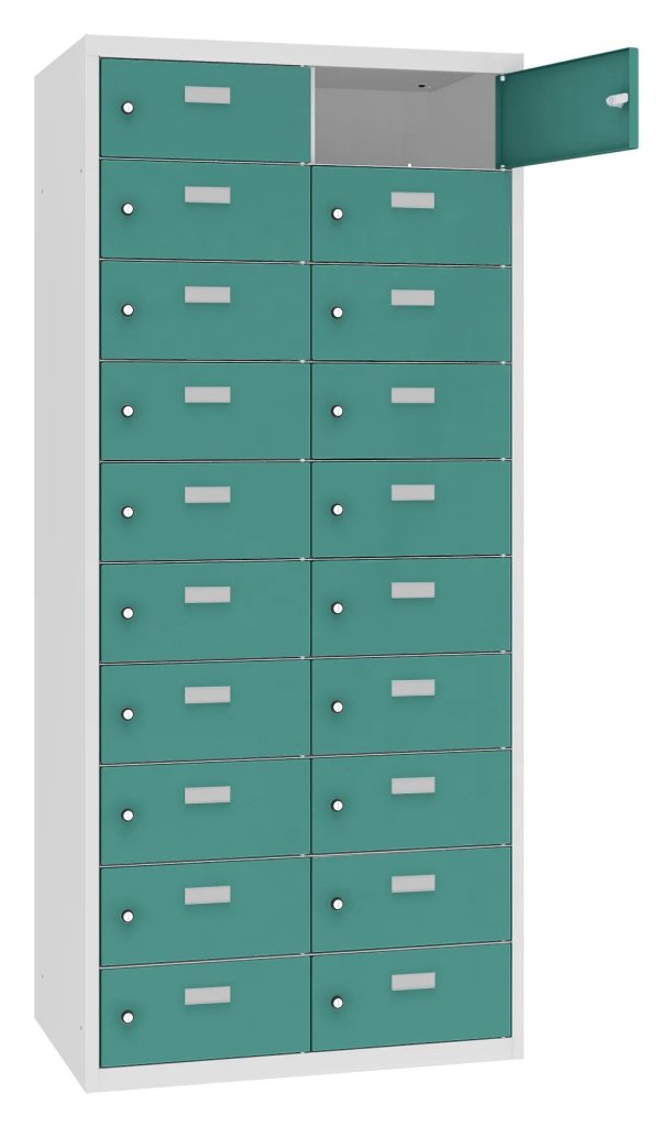 Schowki do przechowywania rzeczy osobistych pracowników, takich jak żywność, telefony komórkowe, dokumenty i inne drobne przedmioty. Idealny do kuchni lub pomieszczeń socjalnych. Wysokość 1800 x szerokość 800 x głębokość 300 mm. 16 odcieni kolorów do wyboru w cenie bez dopłaty.