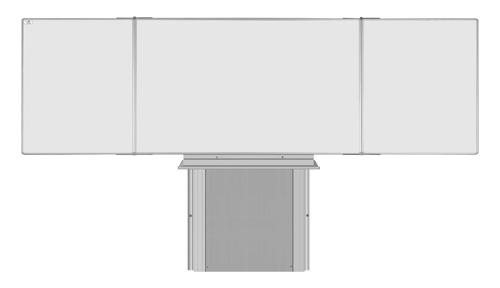 Trzyczęściowa tablica magnetyczna z dwuwarstwową powierzchnią ceramiczną najwyższej jakości na stojaku podnośnym AL + ramię do projektora. Rama aluminiowa anodowana w naturalnym odcieniu, narożniki plastikowe. Wymiary wys. 120 x szer. 200 cm. Projektor może być oferowany na zamówienie.