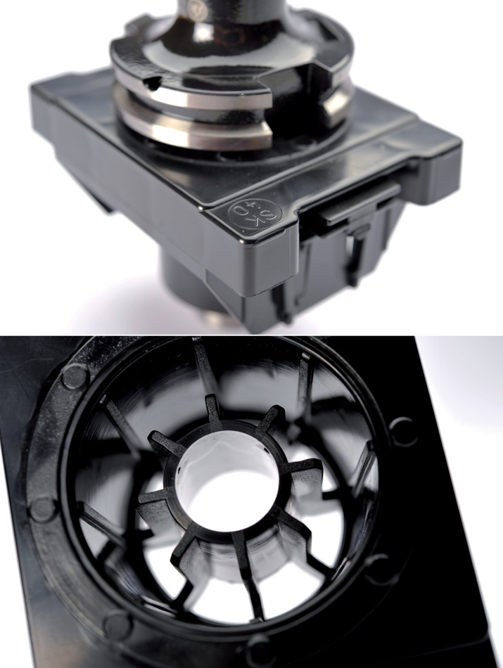 Plastikowy uchwyt do przechowywania narzędzi NC HSK A 40 / B 50. Rozmiar E3, wymiary całkowite uchwytu (szerokość x głębokość) wynoszą 99 x 103 mm.