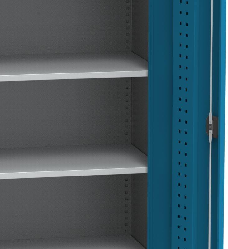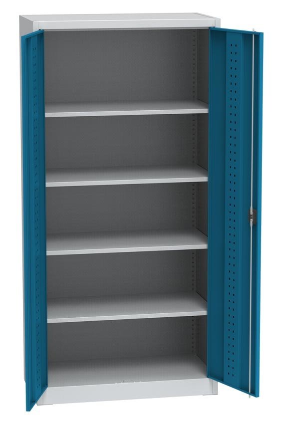 Dwudrzwiowa szafka metalowa z czterema półkami. Wymiary wysokość 1950 x szerokość 950 x głębokość 500 mm. Blokowanie za pomocą cylindrycznej blokady rozstawu osi. Kolor korpusu jasnoszary.