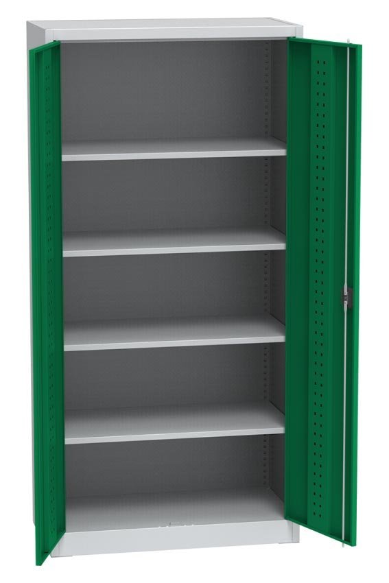 Dwudrzwiowa szafka metalowa z czterema półkami. Wymiary wysokość 1950 x szerokość 950 x głębokość 500 mm. Blokowanie za pomocą pełny opis i parametry