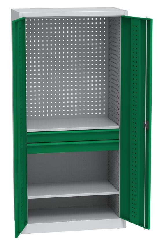Szafa metalowa dwudrzwiowa z 2 półkami, 2 szufladami i wewnętrzną perforacją DVB do montażu szuflad DUS_11_Z10. Wymiary wysokość pełny opis i parametry