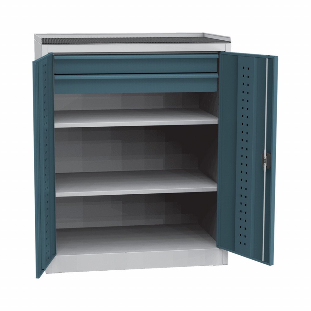 Szafa metalowa dwudrzwiowa z 2 półkami, 2 szufladami i wewnętrzną perforacją DVB do montażu szuflad DUS_11_Z10. Wymiary wysokość pełny opis i parametry