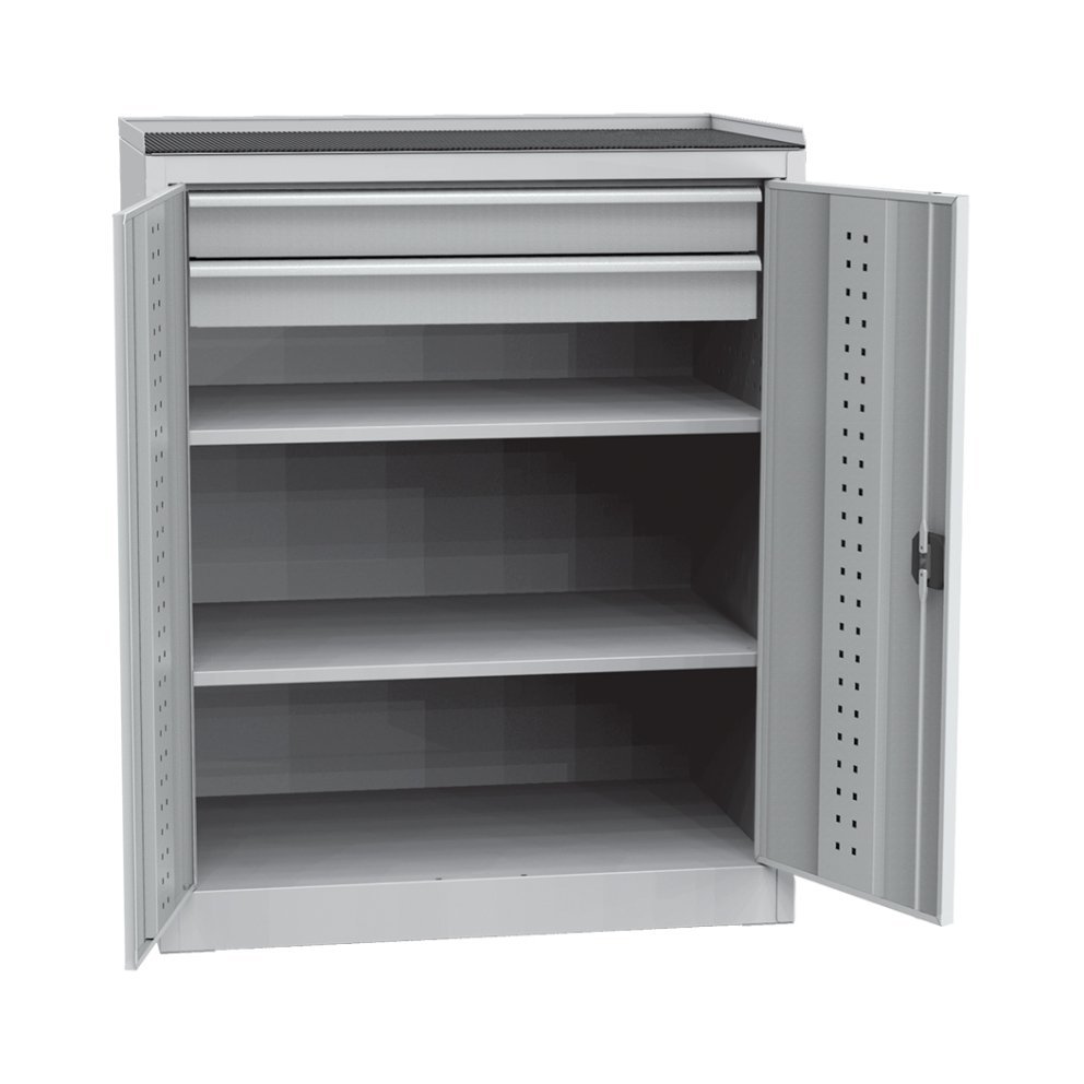 Szafa metalowa dwudrzwiowa z 2 półkami, 2 szufladami i wewnętrzną perforacją DVB do montażu szuflad DUS_11_Z10. Wymiary wysokość 1180 x szerokość 950 x głębokość 500 mm. Blokowanie za pomocą cylindrycznej blokady rozstawu osi. Kolor korpusu jasnoszary.