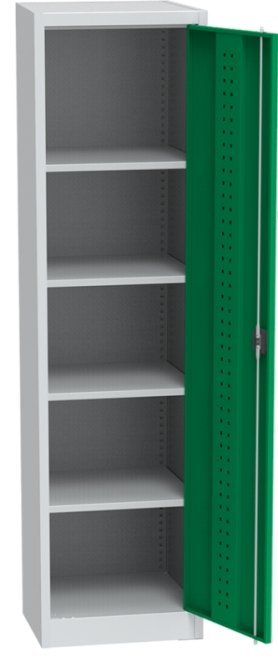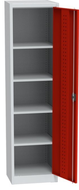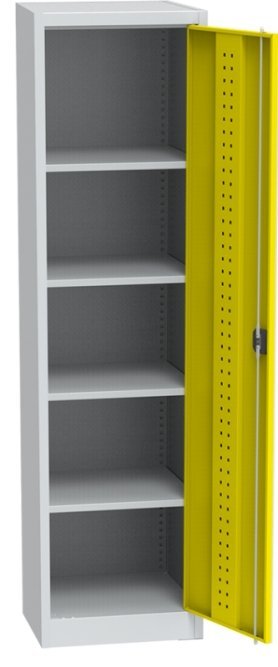 Jednodrzwiowa szafka metalowa z czterema półkami. Wymiary wysokość 1950 x szerokość 505 x głębokość 500 mm. Blokowanie za pomocą pełny opis i parametry