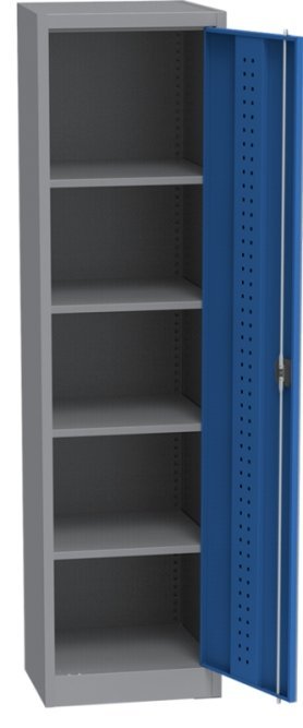 Jednodrzwiowa szafka metalowa z czterema półkami. Wymiary wysokość 1950 x szerokość 505 x głębokość 500 mm. Blokowanie za pomocą cylindrycznej blokady rozstawu osi. Kolor korpusu jasnoszary.