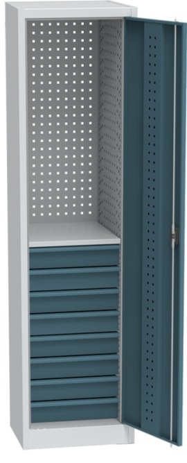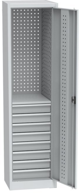 Szafa metalowa jednodrzwiowa z 1 półką, 8 szufladami i wewnętrzną perforacją DVB do montażu szuflad DUS_13_Z10. Wymiary wysokość 1950 x szerokość 505 x głębokość 500 mm. Blokowanie za pomocą cylindrycznej blokady rozstawu osi. Kolor korpusu jasnoszary.