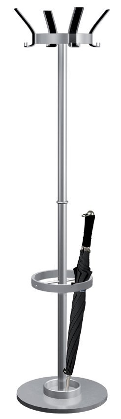 Metalowy wieszak stojący Public, górna część obrotowa z 6 miejscami na kapelusze i 12 haczykami na ubrania, zintegrowany uchwyt na parasole. Ciężka podstawa sprawia, że jest bardzo stabilny. Wysokość 1760 mm, średnica podstawy 500 mm. Obróbka powierzchni powłoką proszkową aluminiowo-srebrną.