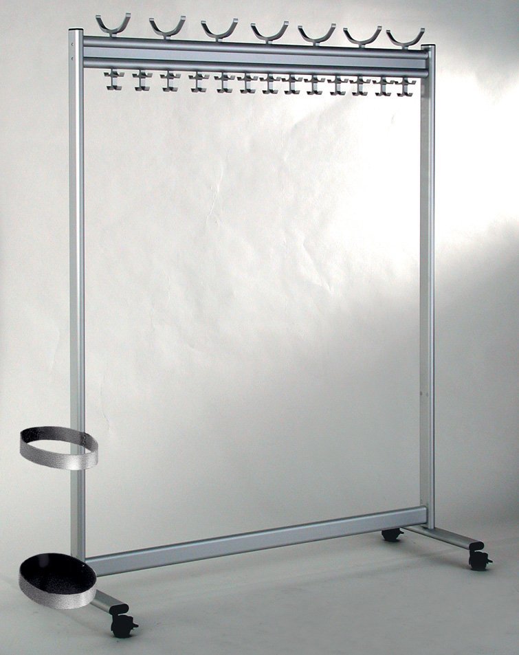 Aluminiowy wieszak na kółkach. 18 miejsc na kapelusze, 68 haczyków na płaszcze. Wymiary w mm (wys. x szer. x gł.) 1700 x 1800 x 400. Uchwyty na parasole nie są wliczone w cenę, można je dokupić za dodatkową opłatą.