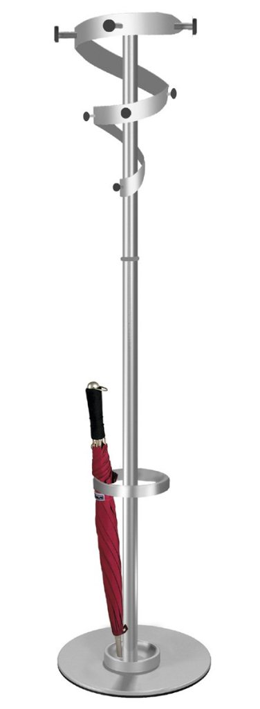 Metalowy wieszak stojący Public, górna część obrotowa z 6 miejscami na kapelusze i 12 haczykami na ubrania, zintegrowany uchwyt na parasole. Ciężka podstawa sprawia, że jest bardzo stabilny. Wysokość 1760 mm, średnica podstawy 500 mm. Obróbka powierzchni powłoką proszkową aluminiowo-srebrną.