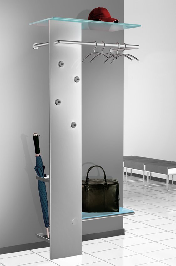 Wielofunkcyjny wieszak ścienny Kent. Duża pojemność dzięki czterem metalowym wieszakom na ubrania i czterem mocnym haczykom magnetycznym na metalowym panelu. Wieszak zawiera również półkę do przechowywania czapek i toreb wykonaną z bezpiecznego szkła satynowego o grubości 8 mm. Obróbka powierzchni farbą proszkową w kolorze srebrnym RAL 9006. Uchwyt na parasol nie jest częścią wieszaka - można go dokupić osobno.