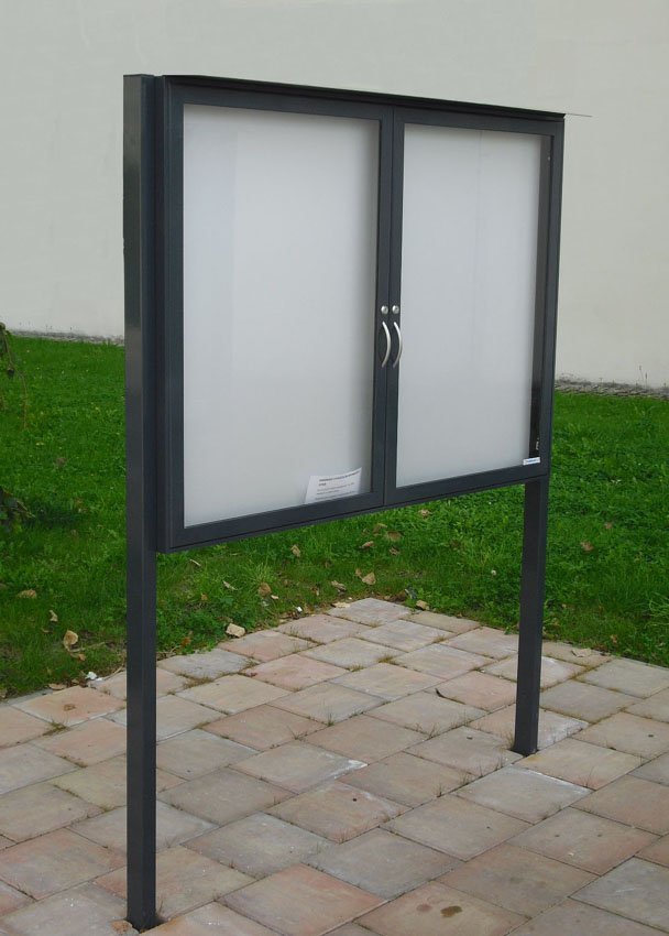 Dwuskrzydłowa witryna odpowiednia do użytku zewnętrznego i wewnętrznego. Odporna na wandalizm. Obróbka powierzchniowa konstrukcji wysokowarstwową farbą anodowaną lub wypalaną proszkowo. Podstawowy projekt kolorystyczny bez dopłaty - srebrna struktura, białe tło. Wymiary wys. 1000 x szer. 1050 x gł. 80 mm.
