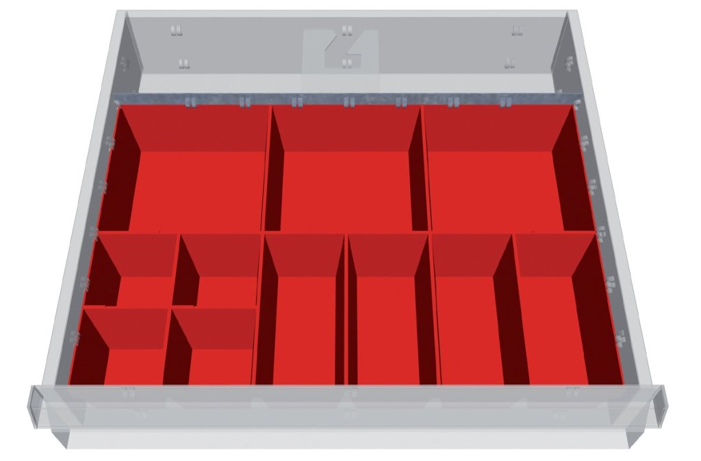 Metalowy podział na szuflady o wysokości 100 mm. Pasuje tylko do wózków serwisowych Bedrunka+Hirth o szerokości 530 i głębokości 500 mm.