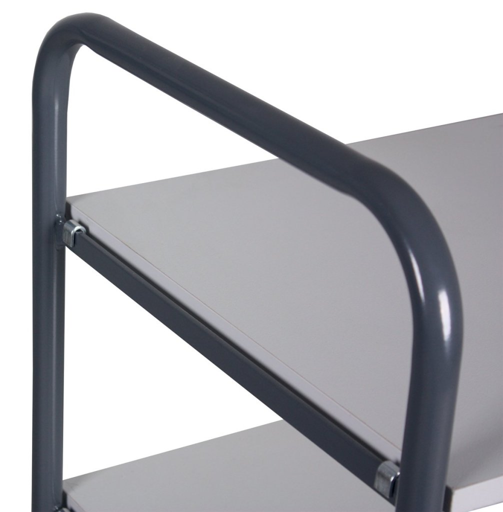 Wózek antystatyczny z półką. Konstrukcja stalowa, powierzchnia załadunkowa z płyty wiórowej - kolor jasnoszary. Obróbka powierzchni ciemnoszarą powłoką proszkową RAL 7024, odporną na uderzenia i zarysowania. Koła antystatyczne z łożyskami kulkowymi, 2 skrętne z centralnym hamulcem Easy Stop, 2 stałe. Wymiary wysokość 1530 x szerokość 910 x głębokość 500 mm.