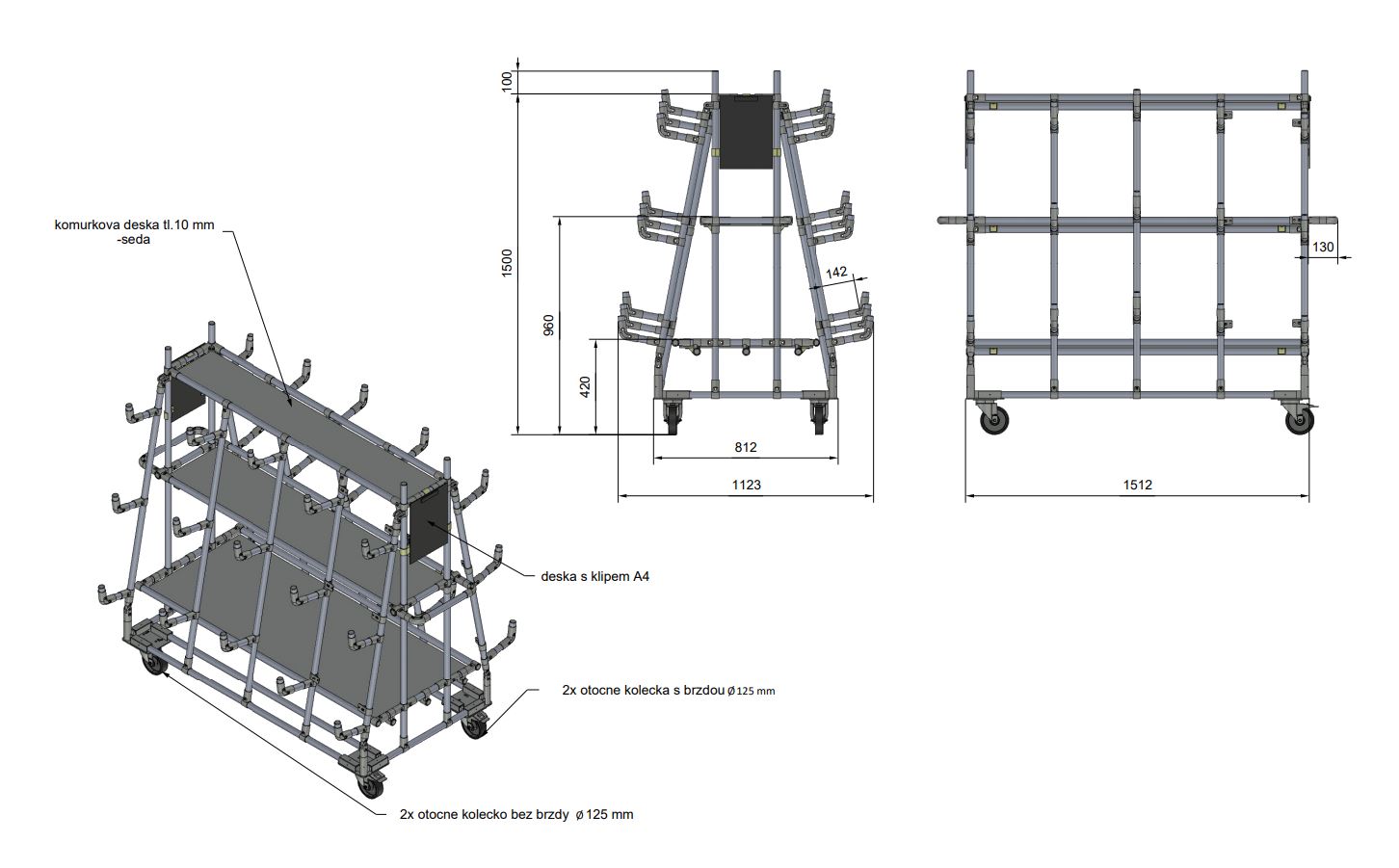 Pick-up do transportu produktów. W zestawie tablica z klipsem A4, kółka obrotowe o średnicy 2 x 125 mm z hamulcem i kółka obrotowe o średnicy 2 x 125 mm bez hamulca.