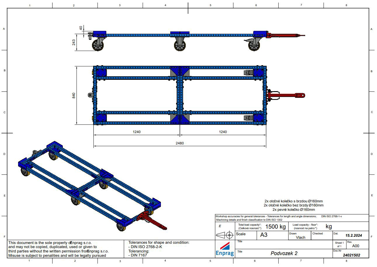 Podwozie do transportu palet EURO, z dyszlem umożliwiającym łączenie kilku sztuk jeden za drugim (tzw. system milk-run). Dzięki nośności do 750 kg idealnie nadaje się do transportu cięższych przedmiotów. 2 kółka skrętne z hamulcem i 2 skrętne bez hamulca, wszystkie o średnicy 125 mm. Wymiary podwozia 1240 x 840 x 238 mm. Możliwość wyboru wariantu ESD.