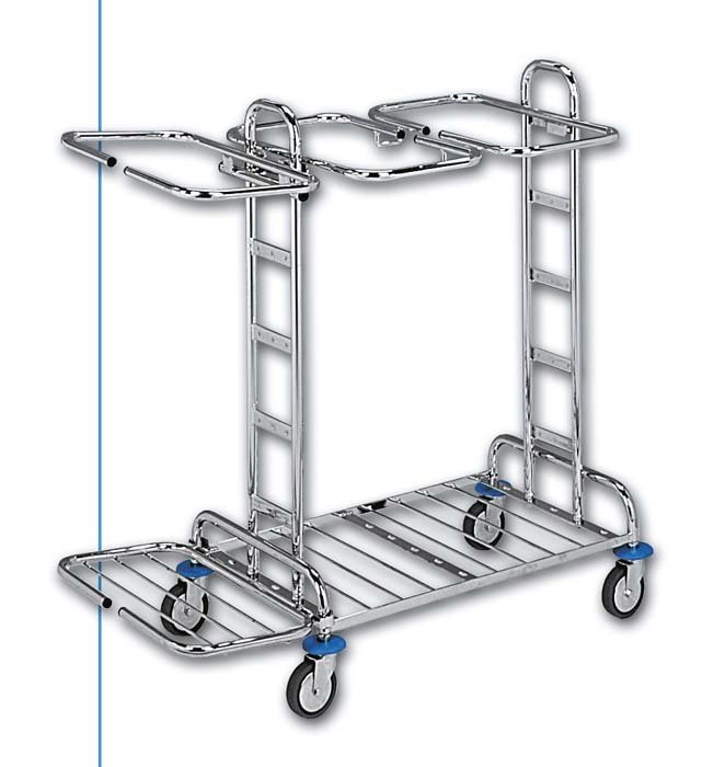 Wózek do sortowania śmieci i prania. Stabilna konstrukcja wykonana z rur stalowych chromowanych. Ciche koła z ochroną przed uderzeniami.