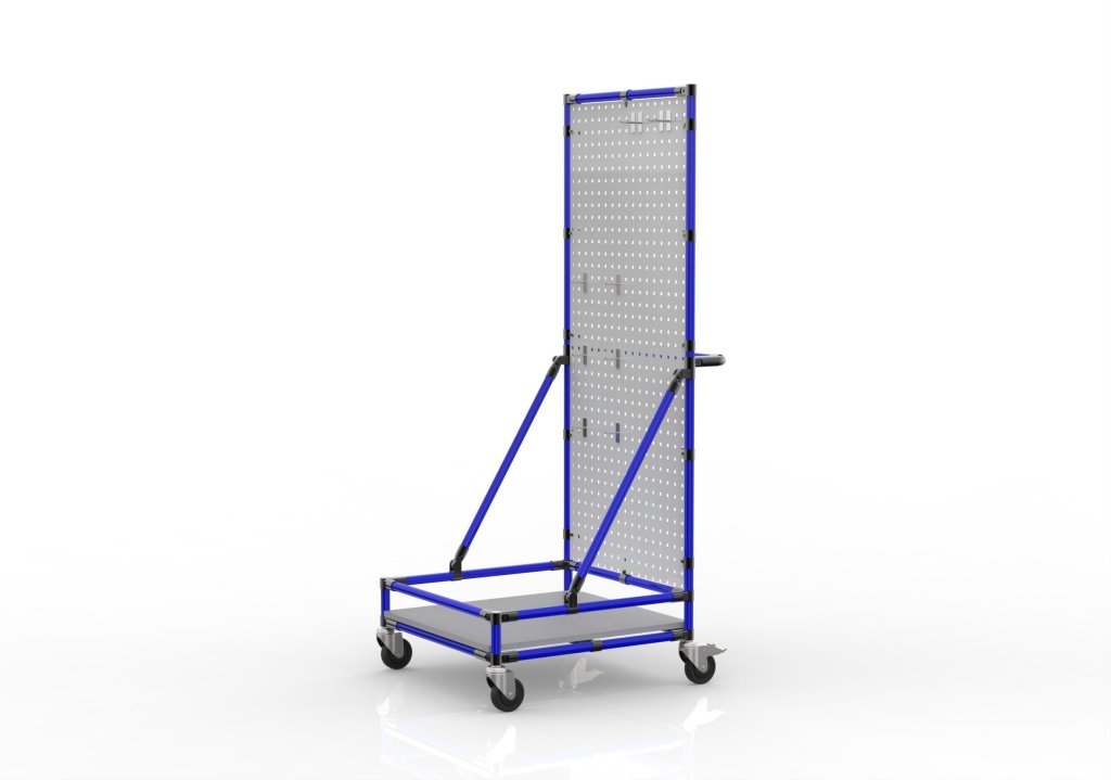 Wózek do sprzątania zgodnie z metodologią 5S. W skład zestawu wchodzi panel perforowany z 10 hakami oraz płyta laminowana o grubości 18 mm. Konstrukcja wykonana z rurek LP-1100, kolor niebieski. Złączki pokryte czarną powłoką proszkową.
