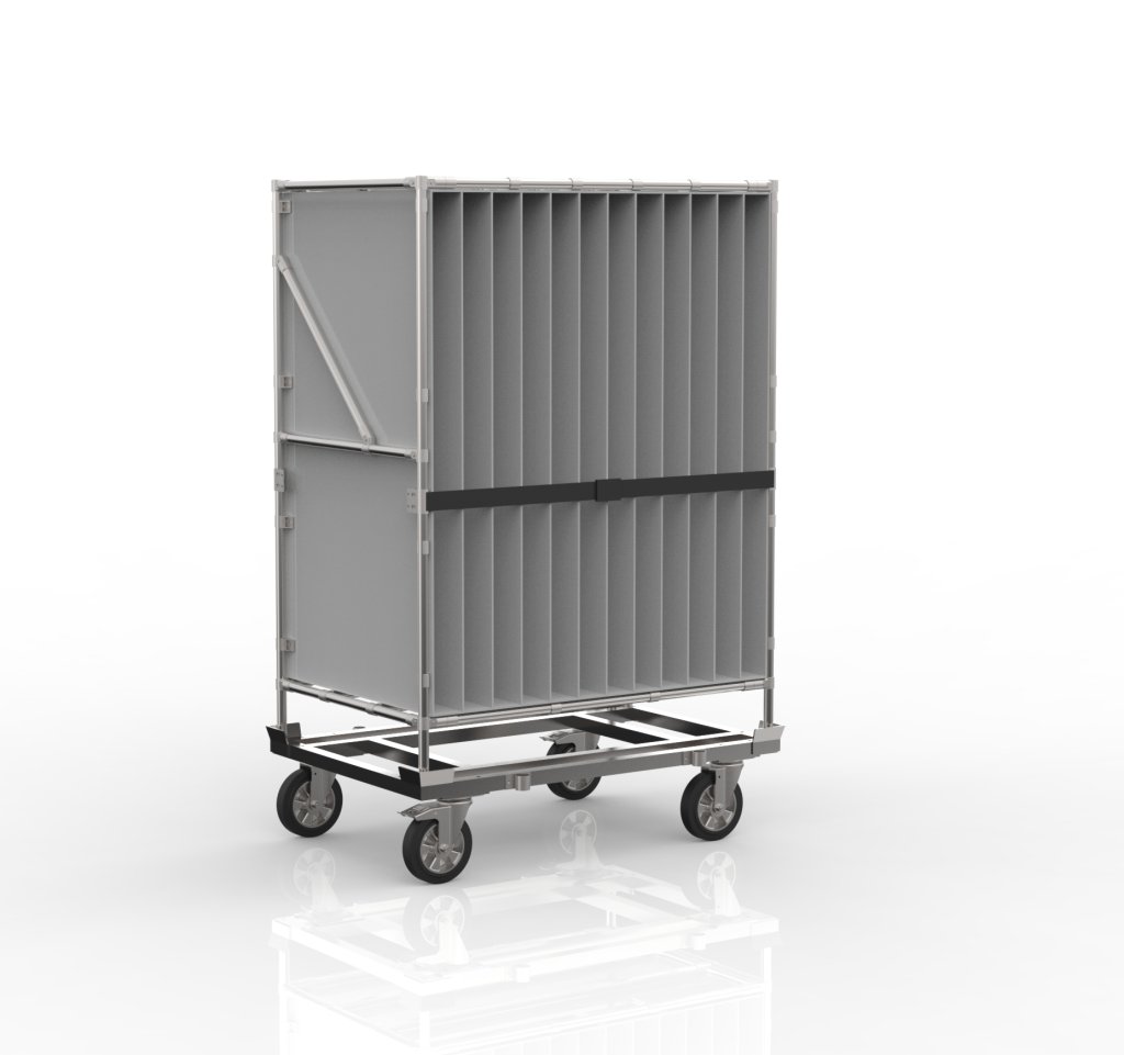 Spawany wózek z nadstawką z systemu rurowego i dwoma półkami. Podstawę wózka stanowi spawana stalowa rama z ocynkowaną powierzchnią, a nadstawka wykonana jest z systemu modułowego z rur, z laminowaną wkładką PP z wyjmowanym dnem w każdej przegrodzie. Do zabezpieczenia przechowywanych materiałów służą pasy mocujące z oczkami po obu stronach. Wózek wyposażony jest w dwa kółka skrętne z hamulcem i dwa skrętne bez hamulca o średnicy 200 mm. Nośność wózka: 240 kg. Nośność półek: 120 kg. Wymiary: 1883 x 1203 x 803 mm.