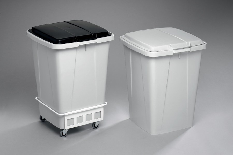 Ruchoma podstawa wykonana z metalu malowanego na biało na jeden kosz na śmieci DURABIN 90 z czterema kółkami. pełny opis i parametry