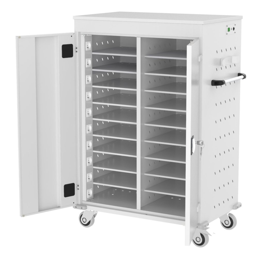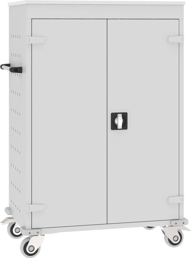 Wózek na laptopy z funkcją ładowania baterii do przechowywania i łatwego transportu. Idealny dla szkół, bibliotek, sal konferencyjnych i nie tylko. Wymiary w mm (wys. x szer. x gł.) 1060 x 920 x 540.