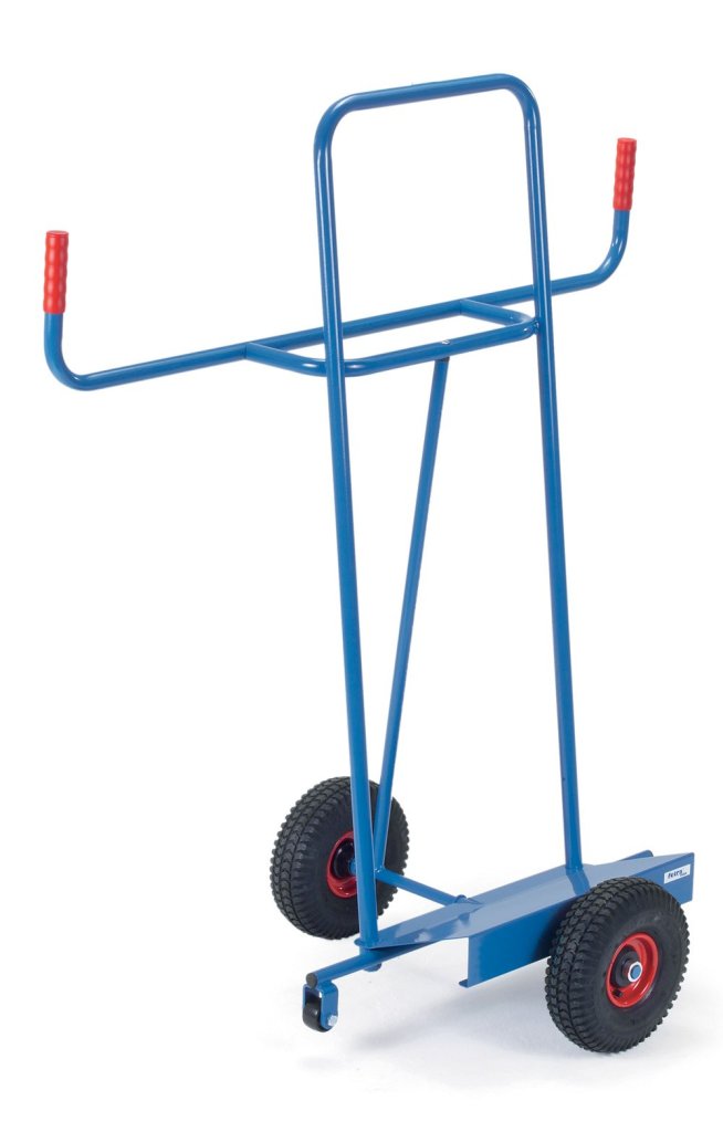Wózek do transportu dużych desek drewnianych i plastikowych. Spawana konstrukcja z rur stalowych. Kolor proszkowy RAL 5010 błękit gencjanowy. Ochrona przed uderzeniami i zarysowaniami. Koła pneumatyczne plus dwa koła podporowe. Wysokość 1440 mm, szerokość 1260 mm, głębokość 680 mm.