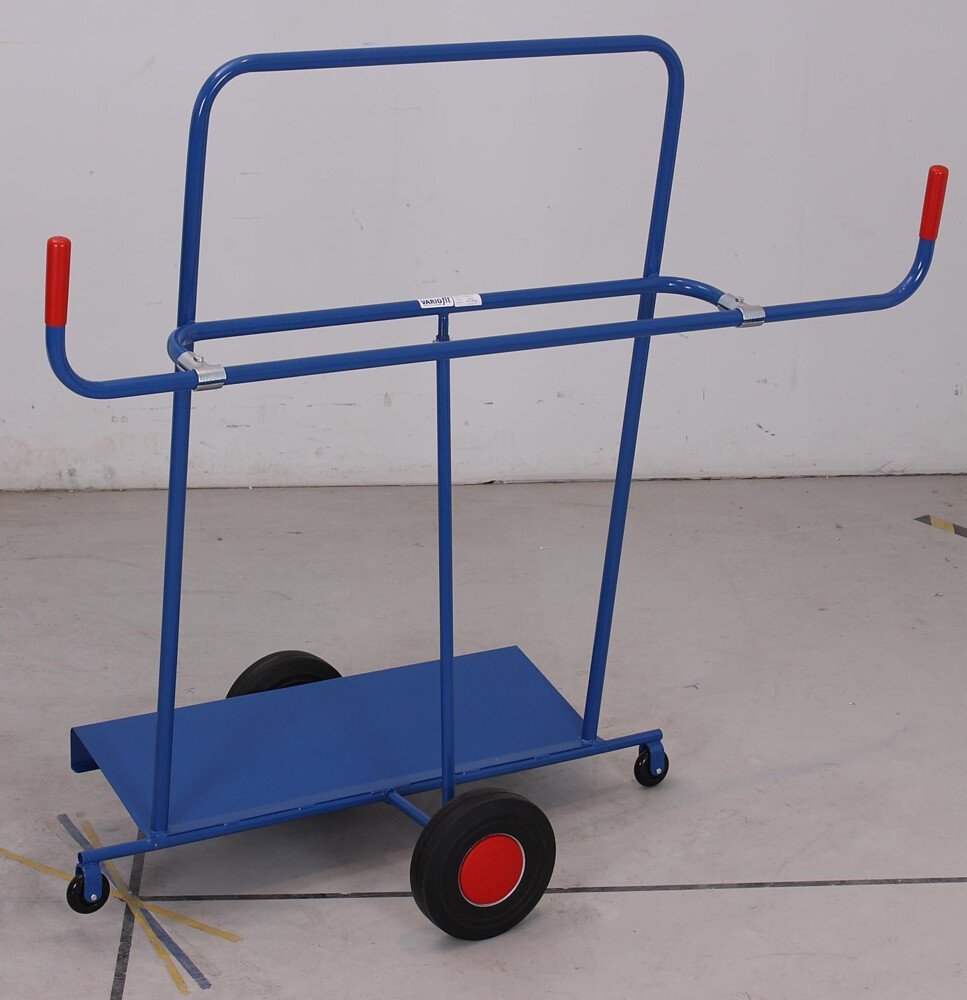 Stalowy wózek na płyty, wyprodukowany w Niemczech. Spawana konstrukcja stalowa. Kolor niebieski RAL 5007. Dwa pneumatyczne koła łożyskowane. Dwa koła podporowe o średnicy 50 mm.