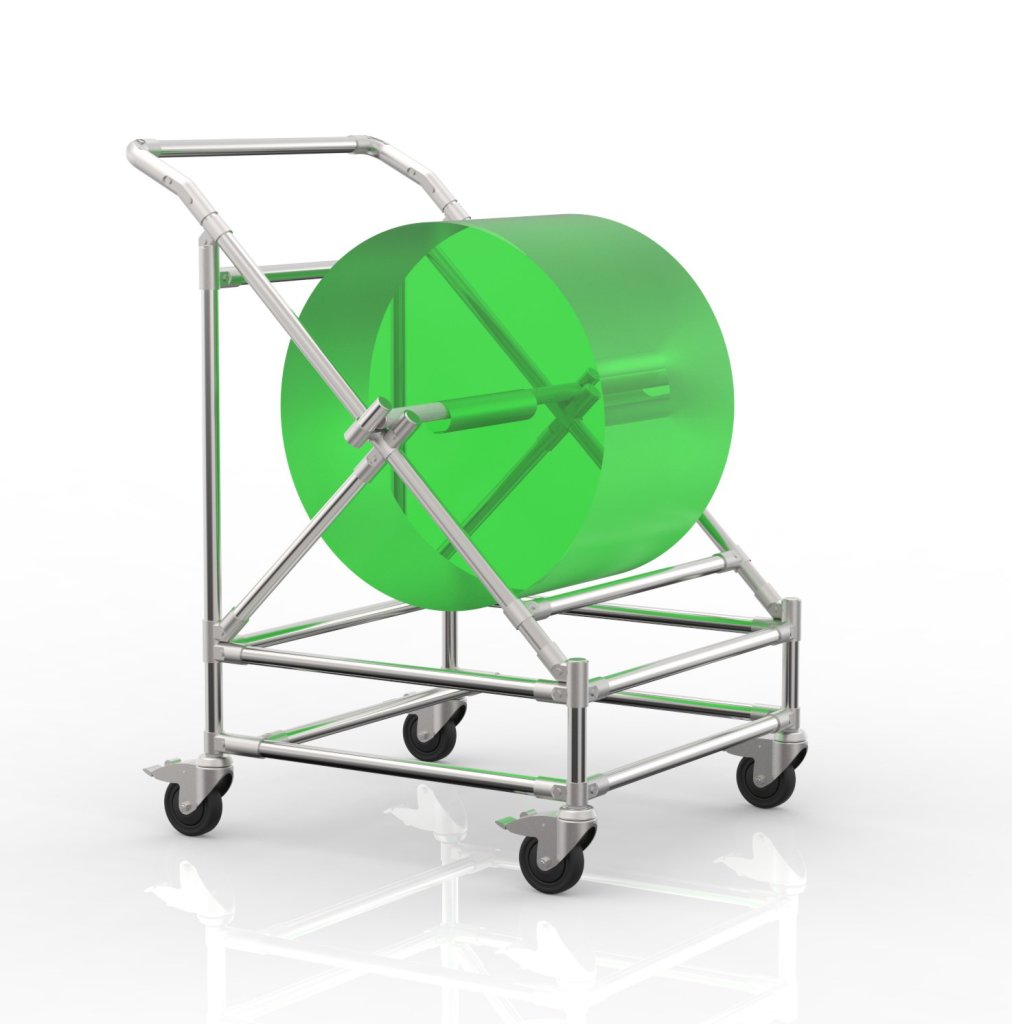 Wózek na szpule to rodzaj ręcznego wózka przeznaczonego do przechowywania i transportu dużych szpul drutu i kabli. Koła wyposażone są w hamulce, które zapobiegają samoczynnemu przesuwaniu się wózka, gdy wózek nie jest używany. Kolor konstrukcji można dobrać według dostępnych na stronie tub.