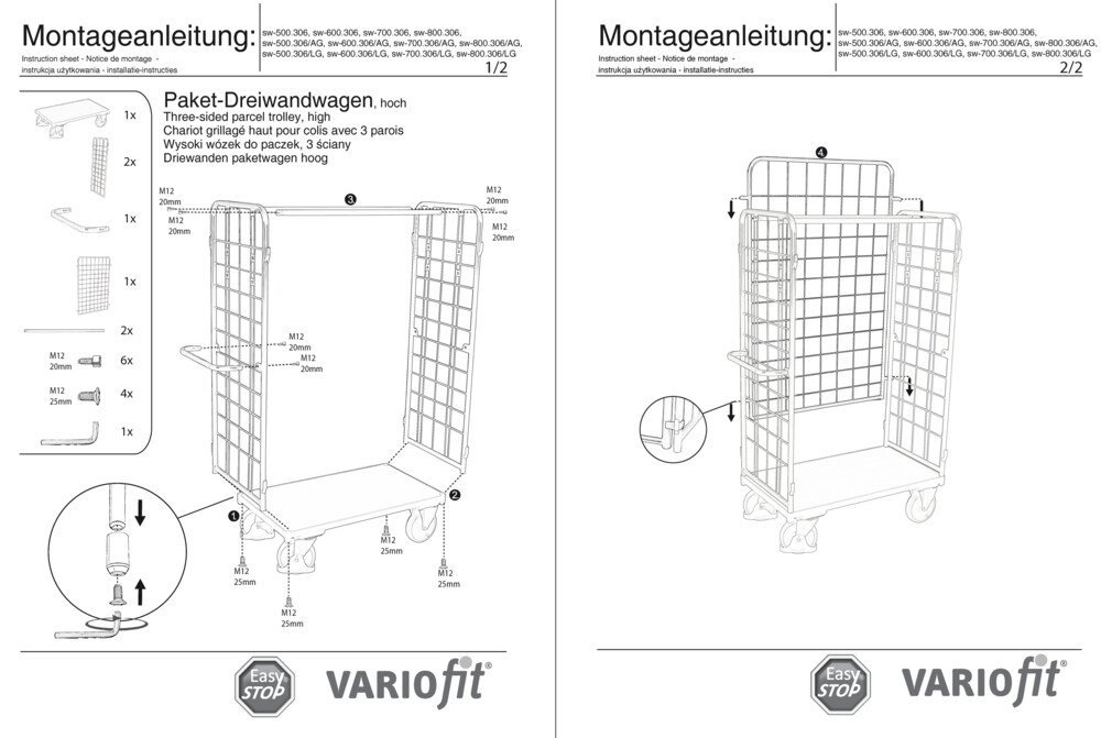 Wózek paczkowy trójścienny, konstrukcja stalowa, boki i ściana tylna z drutu o rozmiarze oczek 120 x 120 mm. Powierzchnia łóżka wykonana z twardego materiału drewnopochodnego. Ściana wzdłużna zdejmowana. Bardzo wytrzymałe koła z tworzywa termoplastycznego, 2 skrętne z centralnym hamulcem Easy Stop i 2 stałe.