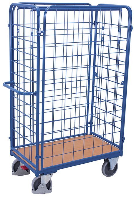 Czterostronny wózek na paczki, konstrukcja stalowa, boki i ściany z drutu o rozmiarze oczek 120 x 120 mm. Powierzchnia łóżka wykonana z twardego materiału drewnopochodnego. Możliwość demontażu ścian wzdłużnych. Koła z tworzywa termoplastycznego o wysokiej wytrzymałości, 2 skrętne z centralnym hamulcem Easy Stop i 2 stałe.