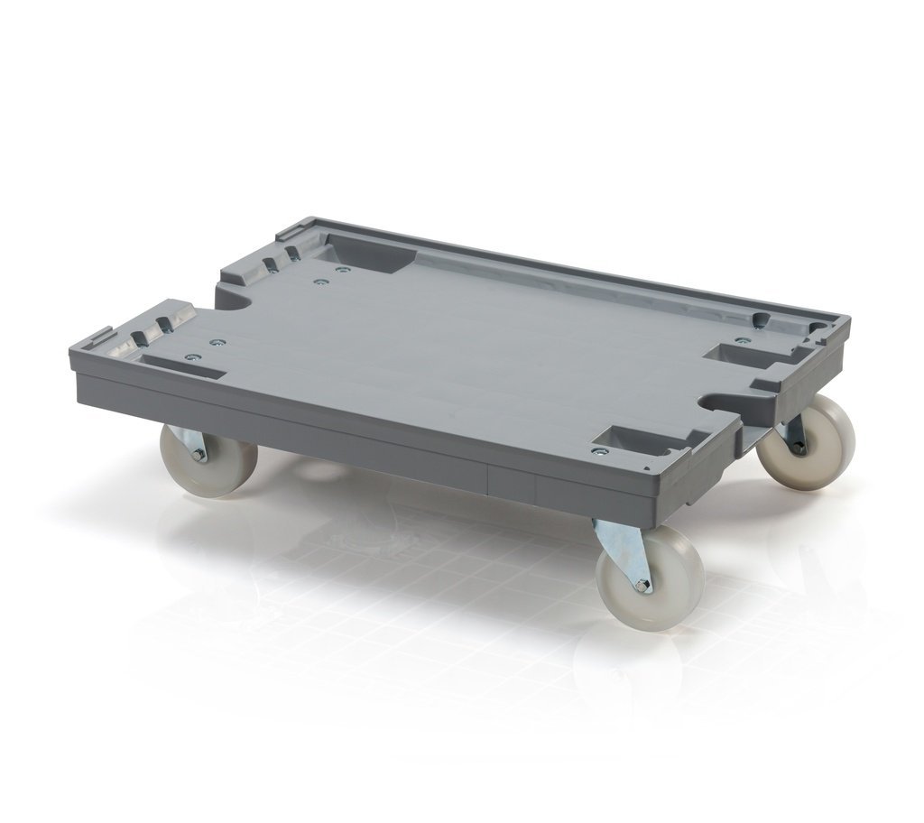 Platforma transportowa. Rozmiar przeznaczony jest do skrzynek o wymiarze 600 x 400 mm, nadaje się również do rozmiaru 400 x 300 mm - 2 pozycje. Gumowe koła, ocynkowane widełki. Wymiary w mm (wys. x szer. x gł.) 150 x 600 x 400. Nośność 250 kg.