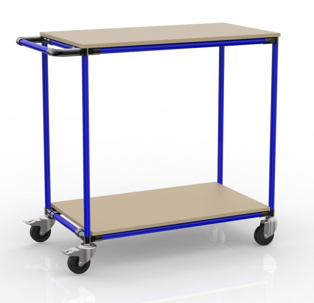 Wózek półkowy z rurowego systemu modułowego stanowi nowoczesną i ekonomiczną alternatywę dla tradycyjnego wózka półkowego o konstrukcji stalowej. Powierzchnię ładunkową wykonano z wysokiej jakości płyt DTDS Kronospan, które zapewniają niezawodne podparcie i są odporne na normalne zużycie. Wózek z półkami jest wyposażony w 4 koła ułatwiające obsługę - 2 koła skrętne z hamulcami i 2 koła skrętne bez hamulców. Nośność na podłogę 100 kg, nośność całkowita 200 kg. Wymiary wózka 1010 x 525 x 975 mm.