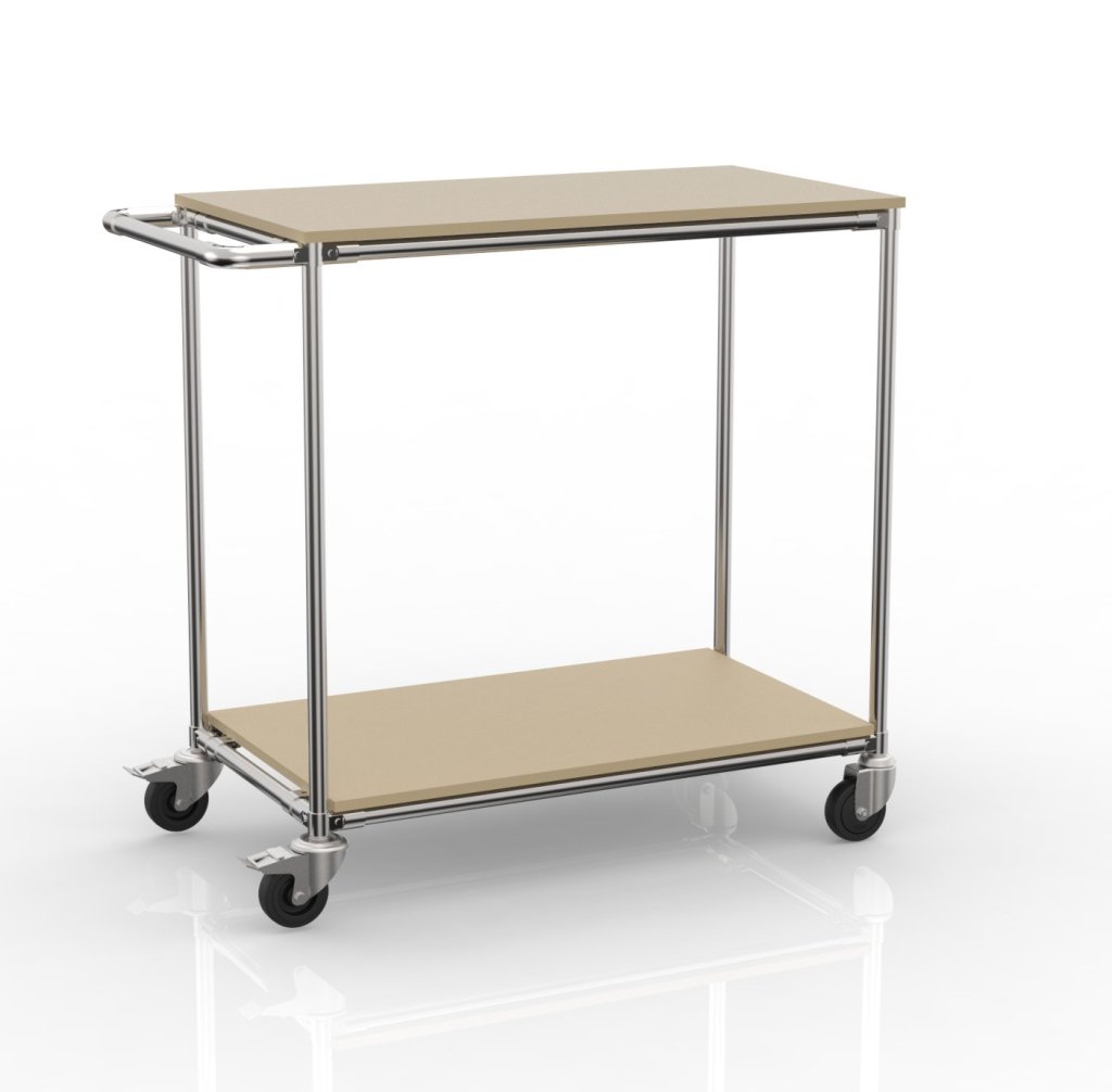 Wózek półkowy z rurowego systemu modułowego stanowi nowoczesną i ekonomiczną alternatywę dla tradycyjnego wózka półkowego o konstrukcji stalowej. Powierzchnię ładunkową wykonano z wysokiej jakości płyt DTDS Kronospan, które zapewniają niezawodne podparcie i są odporne na normalne zużycie. Wózek z półkami jest wyposażony w 4 koła ułatwiające obsługę - 2 koła skrętne z hamulcami i 2 koła skrętne bez hamulców. Nośność na podłogę 100 kg, nośność całkowita 200 kg. Wymiary wózka 1010 x 525 x 975 mm.