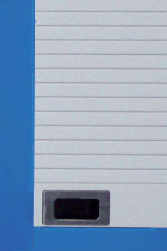 Wózek do szaf produkcji niemieckiej, ściany wykonane z siatki drucianej o rozmiarze oczek 50 x 50 x 4 mm, konstrukcja ze spawanych kątowników stalowych. Powierzchnia łóżka wykonana z twardego materiału drewnopochodnego. Pokrywa przednia i górna są składane do połowy i zamykane na kłódkę. Wysokość użytkowa klatki drucianej 800 mm. Kolor niebieski RAL 5007. 4 specjalne koła pneumatyczne Fetra TPE, z czego 2 obrotowe z hamulcem, 2 stałe.