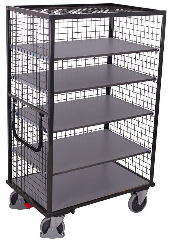 Niemiecki wózek szafkowy z uchwytem, ścianki z siatki drucianej, spawana kątowa konstrukcja stalowa. Drzwi otwierane dwustronnie. Półki wykonane z twardego materiału drewnopochodnego. Nośność jednej półki wynosi 90 kg. 4 specjalne koła pneumatyczne Fetra TPE, z czego 2 obrotowe z hamulcem, 2 stałe.