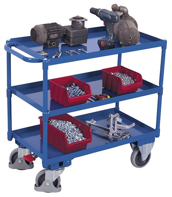 Konstrukcja stalowa, powierzchnia ładunkowa drewniana - buk. Obróbka powierzchniowa powłoką proszkową w kolorze niebieskim RAL 5010, odporną na uderzenia i zarysowania. Bardzo wytrzymałe kółka z tworzywa termoplastycznego z łożyskami kulkowymi, 2 skrętne z centralnym hamulcem Easy Stop, 2 stałe. Wymiary wysokość 1010 x szerokość 1125 x głębokość 625 mm. Wysokość krawędzi 12 mm. 3 półki. Nośność 250 kg.