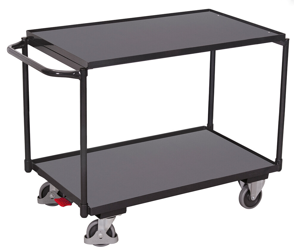 Konstrukcja stalowa, powierzchnia ładunkowa drewniana - kolor ciemnoszary. Obróbka powierzchniowa powłoką proszkową w kolorze antracytowym RAL 7016, odporną na uderzenia i zarysowania. Bardzo wytrzymałe kółka z tworzywa termoplastycznego z łożyskami kulkowymi, 2 skrętne z centralnym hamulcem Easy Stop, 2 stałe. Wymiary wysokość 850 x szerokość 1175 x głębokość 625 mm. Wysokość krawędzi 12 mm. 2 półki. Nośność 250 kg.