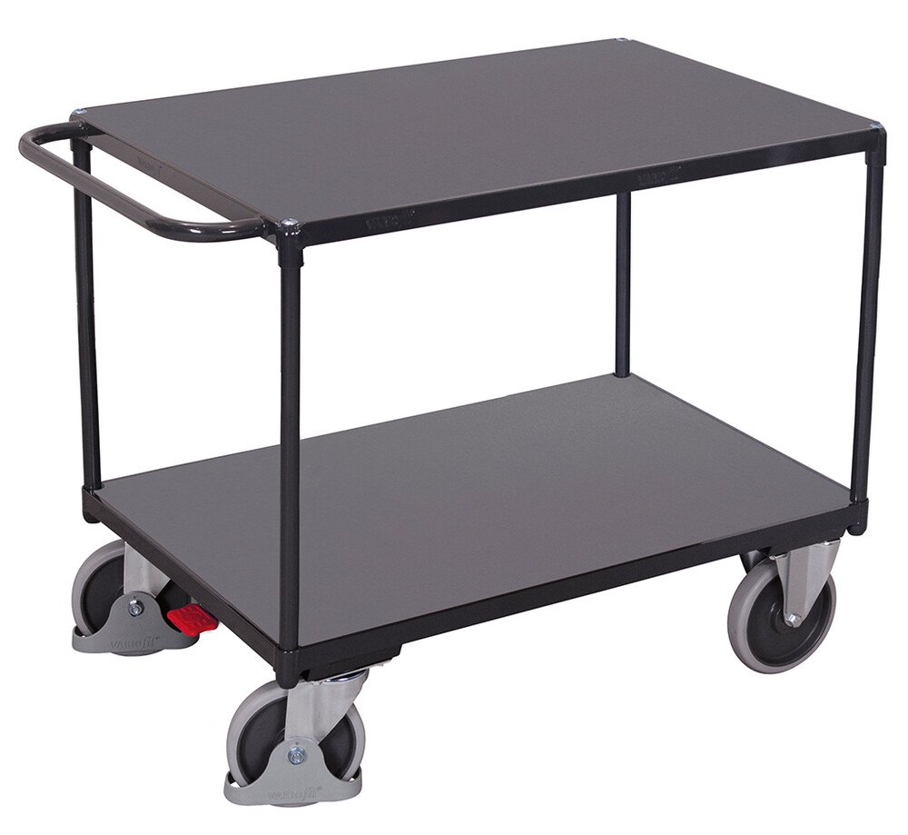 Wózek warsztatowy produkcji niemieckiej, konstrukcja stalowa, powierzchnia robocza wykonana ze sklejki o grubości 19 mm z barierą z blachy stalowej o wysokości 80 mm. Cały wózek jest zamykany. Szafka zawiera 2 wyjmowane półki. Nośność półki 80 kg. 4 specjalne koła pneumatyczne Fetra TPE, z czego 2 obrotowe z hamulcem, 2 stałe.