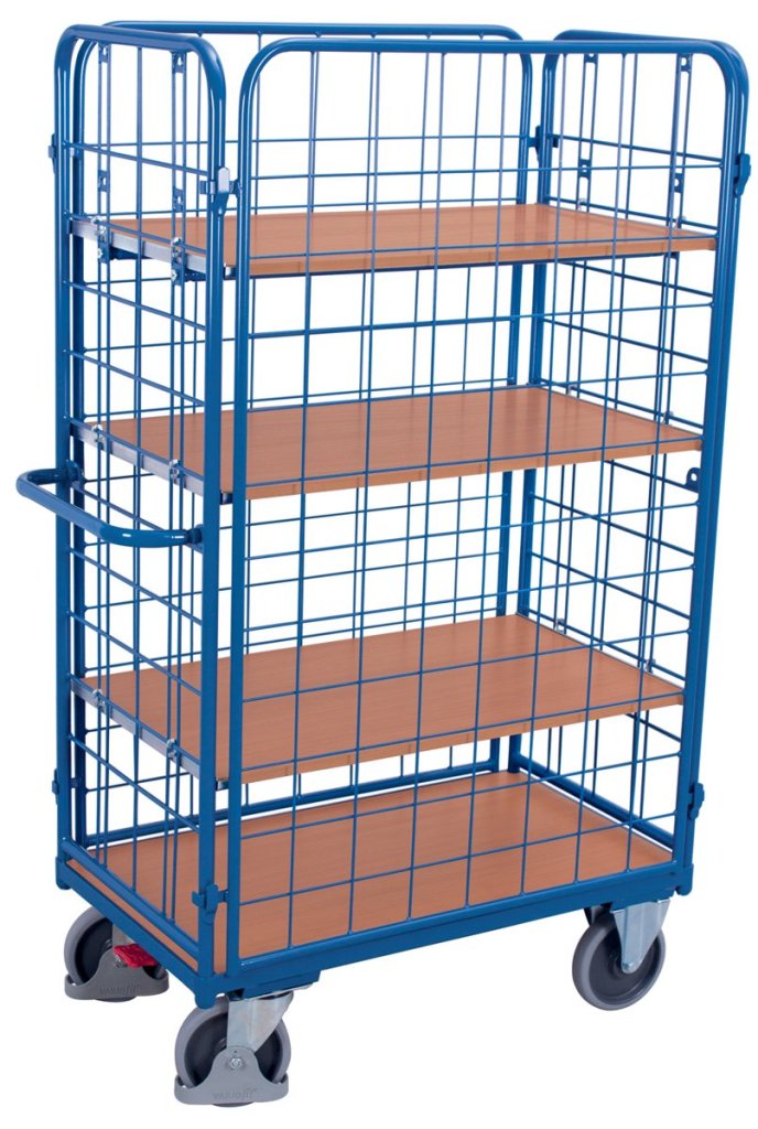 Wózek półkowy wyprodukowany w Niemczech, konstrukcja stalowa, boki z drutu o wymiarach oczek 100 x 100 x 5 mm. Stabilne półki wykonane z twardego materiału drewnopochodnego. System modułowy, który w każdej chwili można przebudować lub uzupełnić. Jedna półka stała i trzy wyjmowane, nośność jednej półki 90 kg. 4 specjalne koła pneumatyczne Fetra TPE, z czego 2 obrotowe z hamulcem, 2 stałe.