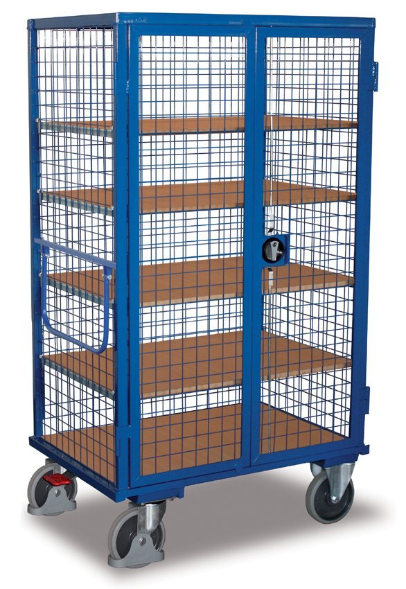 Niemiecki wózek szafkowy z uchwytem, ścianki z siatki drucianej, spawana kątowa konstrukcja stalowa. Drzwi otwierane dwustronnie. Półki wykonane z twardego materiału drewnopochodnego. Nośność jednej półki wynosi 90 kg. 4 specjalne koła pneumatyczne Fetra TPE, z czego 2 obrotowe z hamulcem, 2 stałe.